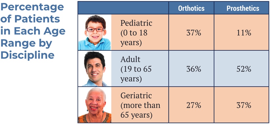 Another example of practice composition that you will find helpful is the age range of the patients served by orthotists and prosthetists. These percentages can help you focus your exam prep on the types of interventions that you are likely to be tested on and how much emphasis is given to each age range